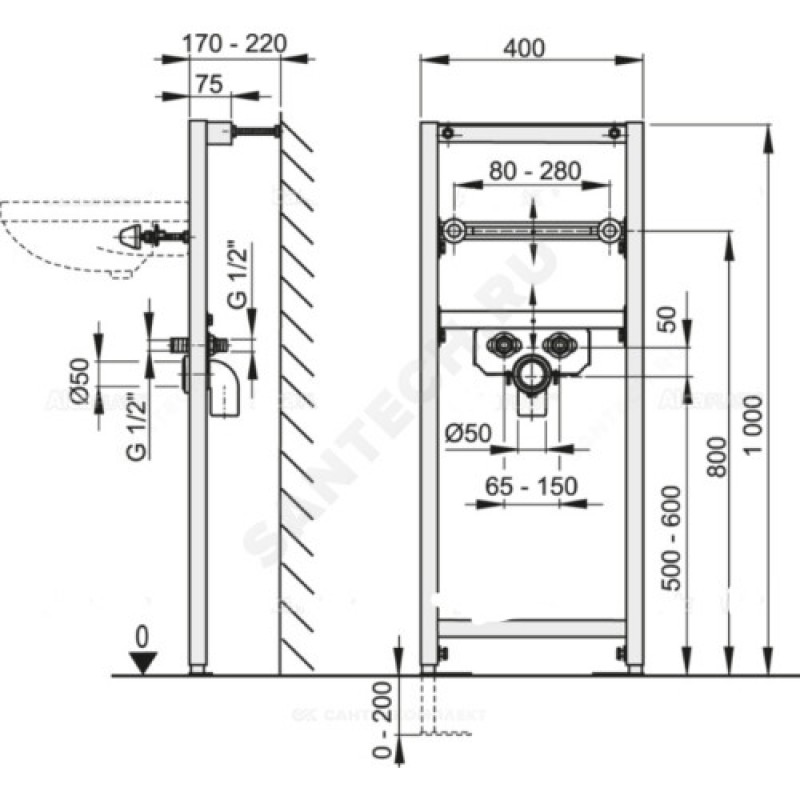 Расстояние между креплениями сантехнического прибора 80-280 мм