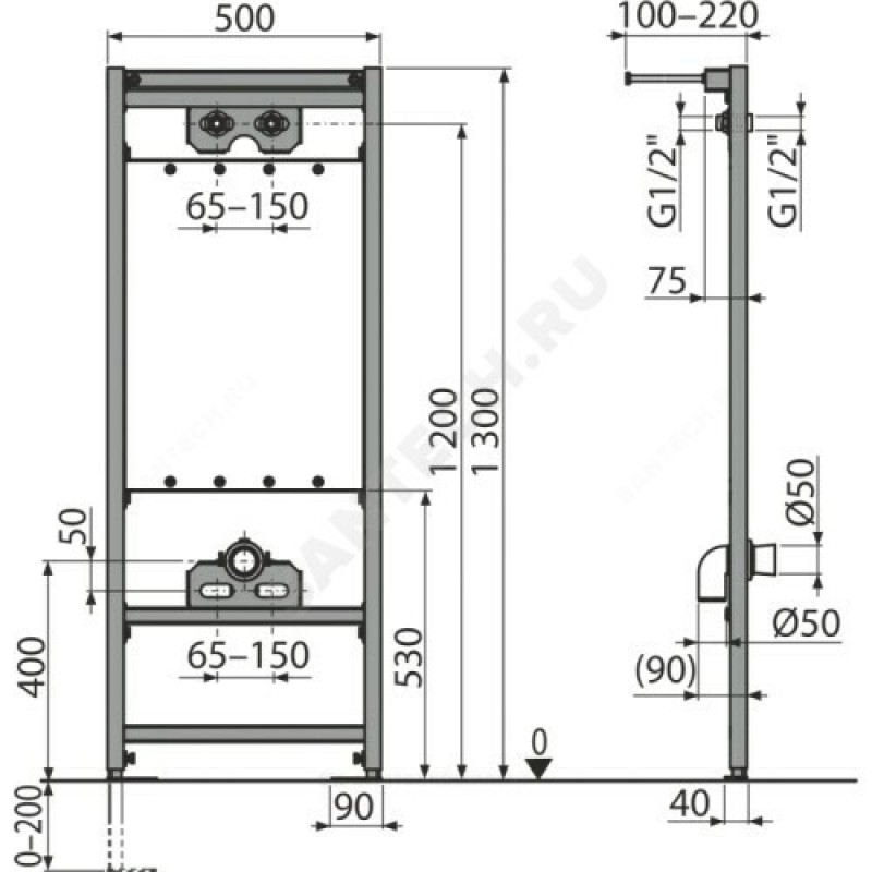 | Комплект поставки | Самонесущий каркас с С-образным профилемМонтажный комплект: винт ?8?60 – 4 шт., дюбель ?12 – 4 шт.Стоковое колено HT50 с прокладкойРезьбовое соединение для подключения воды: G1/2"–G1/2" |