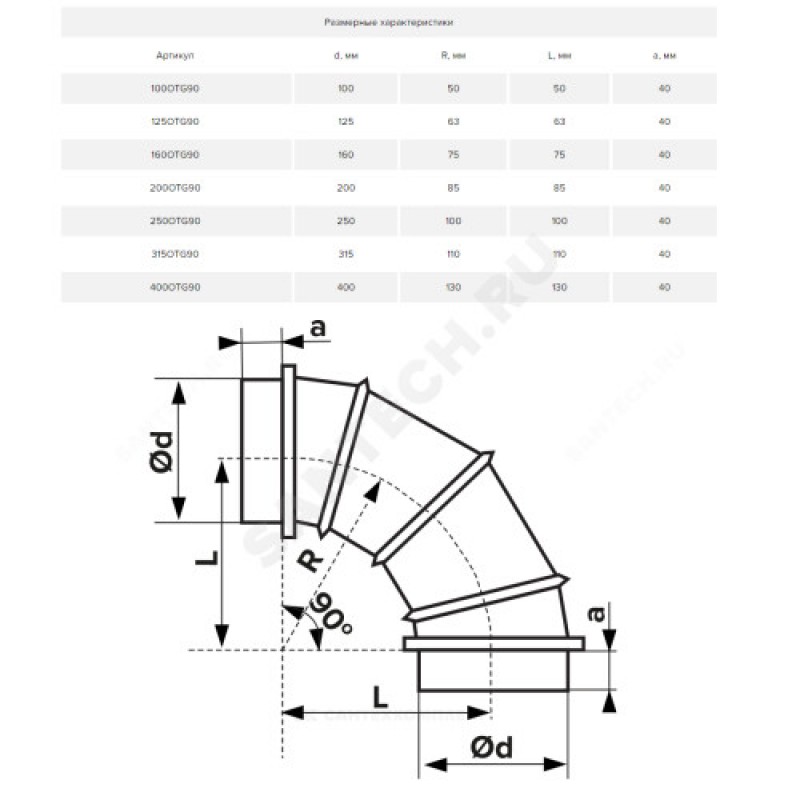 | Наименование производителя | Отвод, серия OTG, для круглых воздуховодов на 90°, D400, оцинкованная сталь |