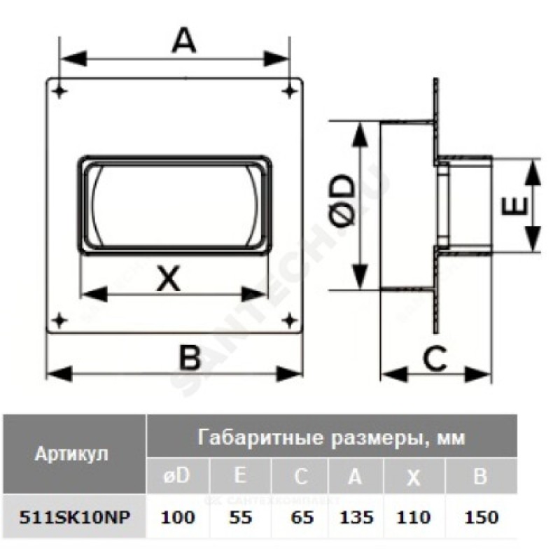 | Диаметр или поперечное сечение воздуховода (вентилятора) | 55х110/D100 |