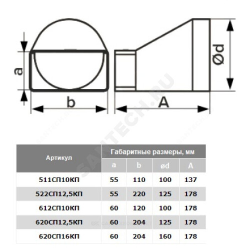 | Диаметр или поперечное сечение воздуховода (вентилятора) | 55х110/D100 |