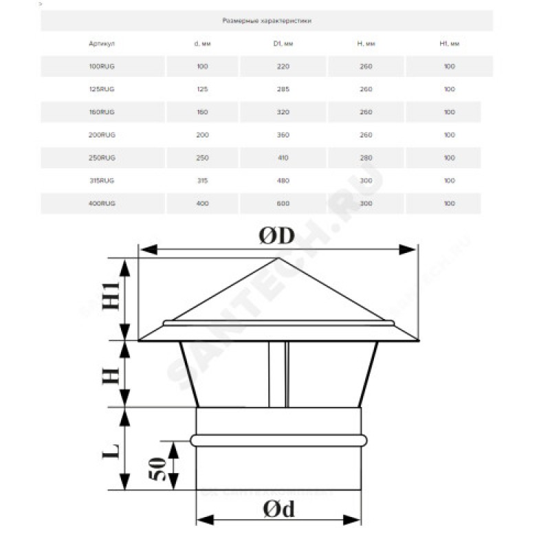 | Наименование производителя | Зонт крышный, серия RUG, для круглых воздуховодов, D150, оцинкованная сталь |